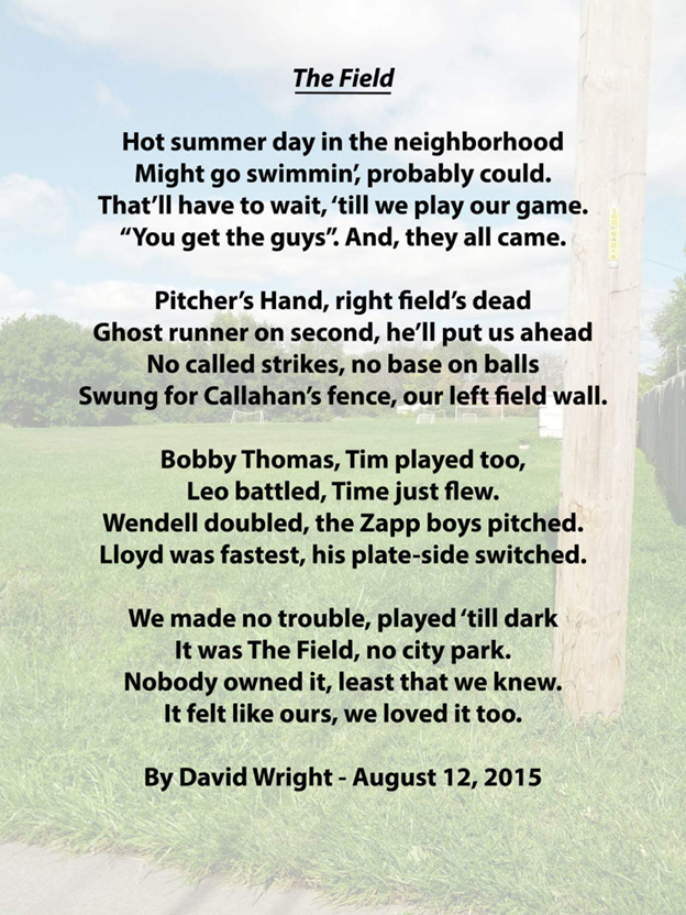 Ten years ago this month, I returned home from spending nearly 90 days in Europe serving with a ministry. Exhausted from the travels, I took a Wednesday afternoon off and went to an afternoon professional baseball game. All alone (my choice for that afternoon), I sat along the third baseline side of Victory Field in downtown Indianapolis. I thought about the trip I had just completed, the way God blessed it. I thanked Him for my family and how I looked forward to reconnecting with our kids and friends. I also took time to daydream about those days in Beech Grove when a dozen boys, on summer days just as this day at the ballpark was, would meet in our neighborhood field to play baseball. We would not have enough guys to have nine players for each team. So, we had to get creative. The poem is simply called The Field.